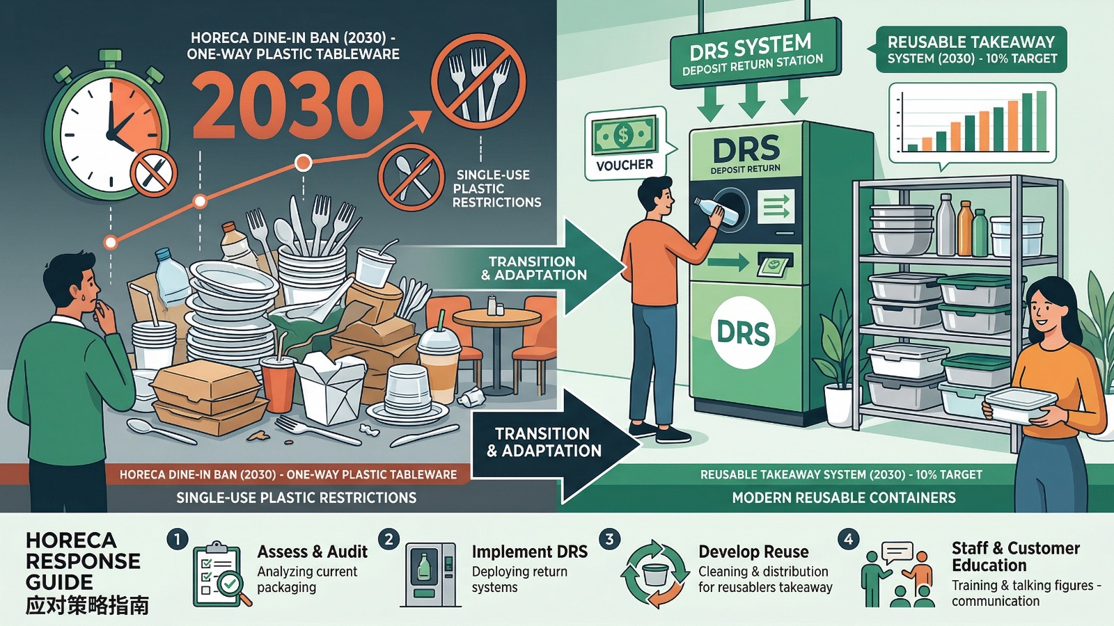HORECA 堂食禁止一次性塑料餐具和盘子,必须用可重复使用的。外卖 10% 产品需使用可重复使用包装。单份小包装(咖啡奶精、糖、酱料)逐步收紧,改用大包装自助或可重复使用容器。